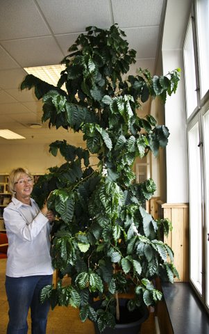 Kaffeplanter kan bli høye. Anne Lise har hatt en slik plante på biblioteket i Halden i over 10 år og nå har den nådd opp til taket og det er ca. 3 meter.