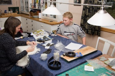 Det er alltid hyggelig med barnebarn på besøk og her har vi både barn og barnebarn. Rebekka og Daniel har slått seg til ved rotebordet til kona. Her leses lekser og her kuttes glass til smykker. Allbruksbord i kjøkkenavdelingen er ikke dumt.