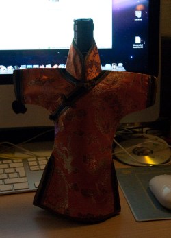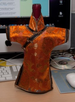 Riktig antrekk er meget viktig, for noen i allefall. Dette fine antrekket fikk jeg av min kinesiske venninne som forøvrig driver stamrestauranten min her i Oslo. Nå behøver ikke vinflaska å fryse, eller man kan benytte den for å skjule innholdet og si at vina er uten slike alkohyler som han Gresstusta misliker så sterkt:-)