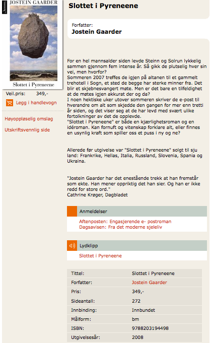 Jeg har ikke noe slott der og har vel heller ikke noe ønske om det, men en av bøkene til Jostein Gaarder heter så. Jeg likte boka og Gaarder er flink til å få tankene til å fly. Dialogen i boka flyter greit og jeg hadde glede av denne boka mens jeg kjørte i stormbygene over til vestlandet sist helg.