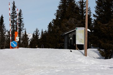 Kona smilte godt og avslappet da vi kunne rusle videre uten tanke på slike krypende dyr. Flere strabaser senere nådde vi grenseområdene og da så vi at sivilasjonens utpost var nådd. Selv grensebommene var hevet og innkrevinga var stoppet opp. Her i ytterste villmarka stopper alt opp. Riktignok oppdaget vi spor som gikk videre, men turde ikke utforske dette. Å gi seg ut i det ukjente er ikke alltid like moro, man aner jo ikke hva som lurer rundt neste sving. Hadde man bare hatt litt mere eventyrlyst så hadde jeg nok fulgt disse spora også.
