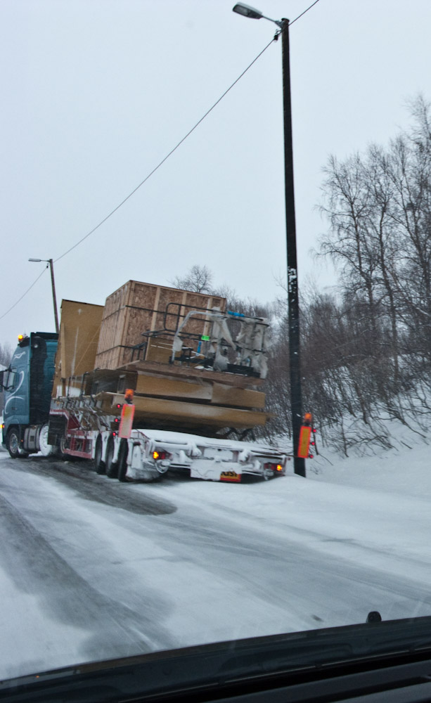 Denne bilen greide ikke bakken og tilbake og ned i grøfta. I alt var det 5 trailere som stoppet bare på veien fra Neiden, hvor jeg kom ned fra Finland og inn til flyplassen på Høybuktmoen.