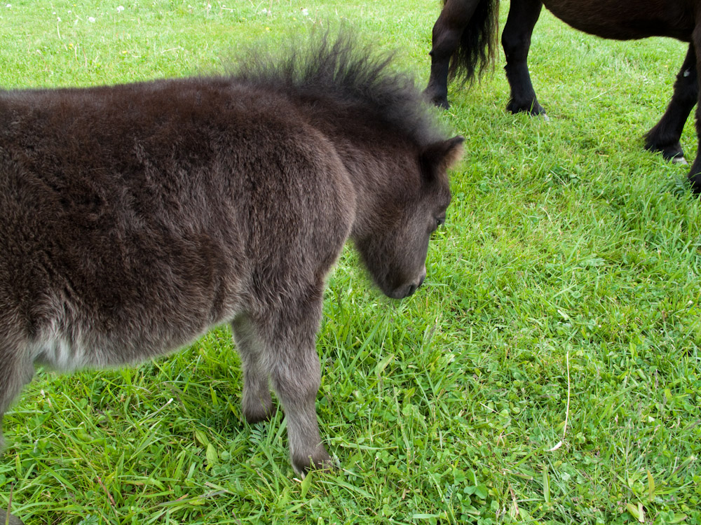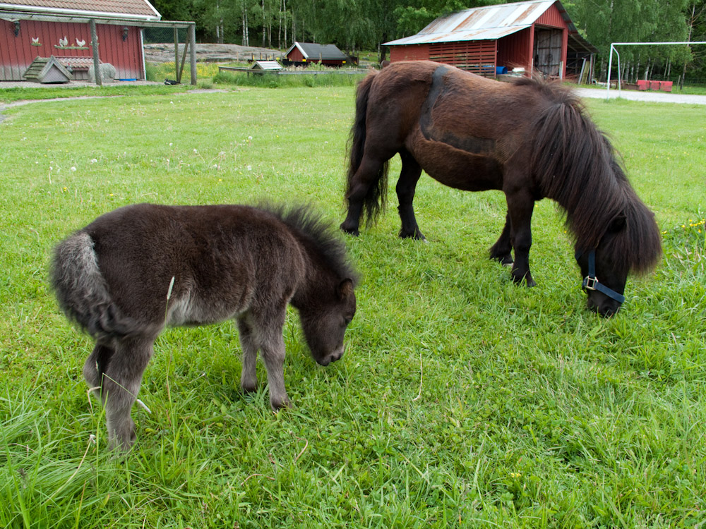 På dette neste bildet er det kanskje mulig å se nærmere hvor liten hun er. Føllet ruslet rundt på ikke helt stødige ben, men apetitten var det ingenting i veien med.