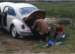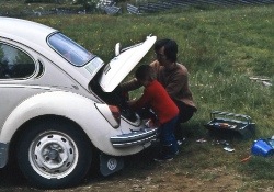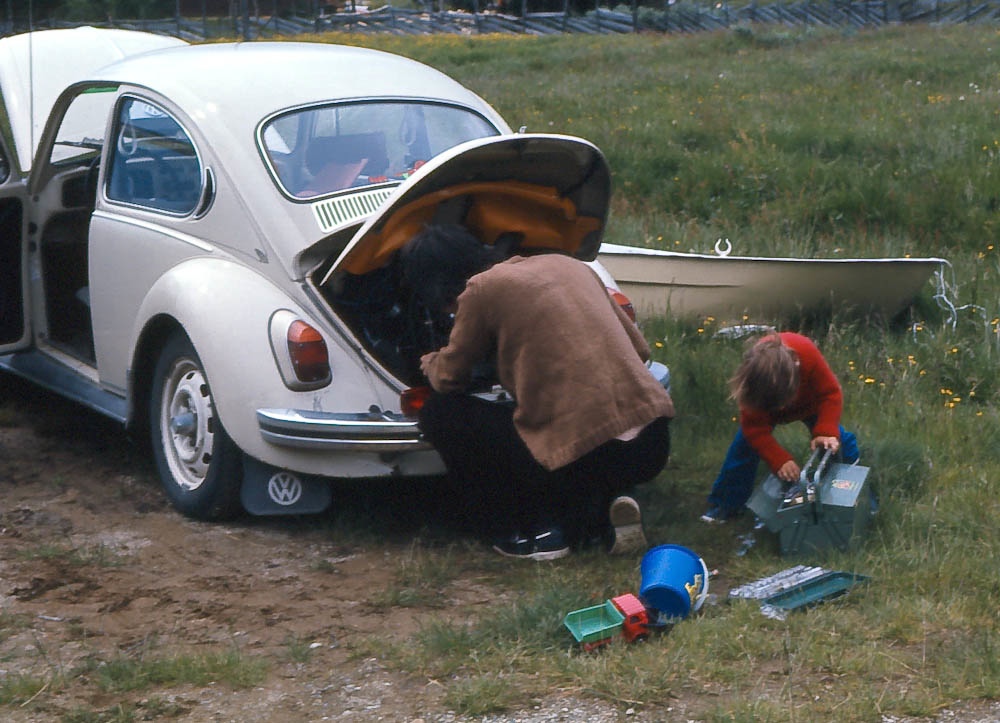 Her er det jeg som skrur motor en gang vi var på hytta i Trysil, nærmere bestemt Bittermarka. Hans-Chr. var liten den gangen, men ivrig medhjelper i motoren.
