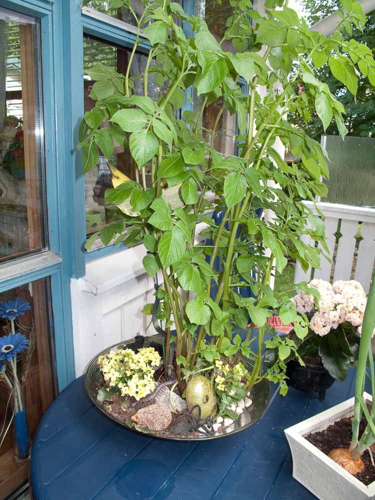 Tidligere i år tok mor og satt to poteter i et fat ute på verandabordet. De er fortsatt like hadre og ligger ikke i noe jord, men spirer gjør de. Som man kan se av bildet har planta blitt veldig høy. Hun hadde ikke trodd at dette var mulig, men her er planta.
