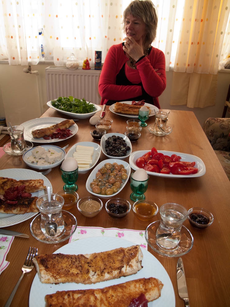 Frokost på hotellet ble det ikke noe av, men derimot en stor frokost hjemme hos vennene våre i Denizli. Det er bare 2 km mellom hotellet og deres leilighet. Bordet bugnet av mat og slik frokost har de normalt lørdag og søndag når de har tid til å stelle i stand frokost. Resten av uka blir det noe enklere sa de:-)