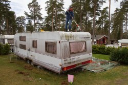 Å vaske vogna er første sats i denne sommersymfonien som ikke mottar noen statstøtte. Vannet renner og møkka fordrives. Utrolig hvor mye som samler seg på vogna i løpet av et år. Egentlig burde vi ha bunnstoff på taket av vognene. Med all den nedbøren vi har står det konstant fuktighet på toppen og da gror skjell og ruer, iallefall gjør det jo på en båt som ligger i vannet. Bunnstoff hadde kanskje hjulpet slik at vogna lettere hadde sklidd gjennom sommeren med all dens merkelige nedbør?