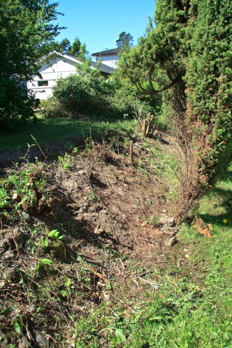 Da jeg kom hjem på fredag ettermiddag møtte jeg kona i full jobb i hagen og det var bare å henge seg på. Skråningen ned mot naboen skulle ryddes og naboen skulle få overta den biten for å beplante den som de vil. Selv om det er vår eiendom er det jo de som ser den og da ble det til at de kan få utnytte den som de selv ønsker. I løpet av fredag var det meste ryddet og med lørdagen til hjelp så ble det nesten bra. Skråningen på oversiden av huset har naboen der «gitt» til oss og den har vi beplantet som vi ønsker. Naboen ble veldig glad for å slippe å ha noe med den å gjøre. Forholdet blir det samme for oss når det gjelder skråningen nedenfor huset.