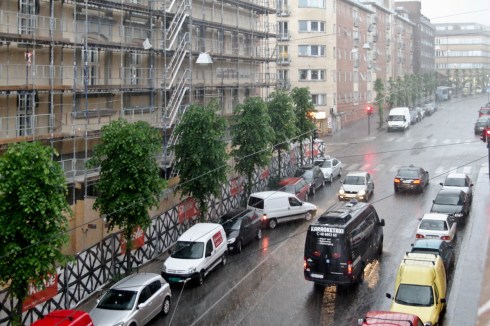 Etter at jeg kom hjem fra quizen på Jasmin i kveld begynte det å regne kraftig. Bråket utenfor vinduet var ganske kraftig og selv om jeg har masse bilder av regn og denne Trondheimsveien fra før så ruslet jeg ut på verandaen og knipset nye bilder. Det er jo det man har kamera til – dokumentasjon. Min værhukommelse er særledes ille, må være teflonforbundets glatteste hjerne.