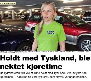 Pro-tysker, hmmm. det var også et uttrykk. Farlig å få et slikt menneske inn i bilen sin. Tenk om det også kom noen tyske gloser, bilen kunne jo bli deprimert.