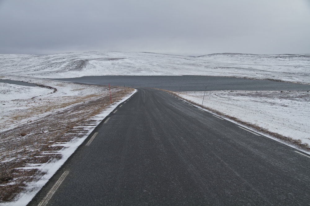 På vei fra Båtsfjord mot Tana tidligere i dag stoppet jeg og tok en del bilder underveis. Før jeg kom opp på fjellet var det bra veier, men på toppen lå det en del snø. Bak meg kom det en bil som blinket og kjørte forbi da jeg stanset for å ta noen bilder. Litt lenger oppe i bakken så jeg at bilen senket farten noe veldig og tenkte kanskje at han var nysgjerrig på hva jeg drev med. Jeg tok mine bilder og kjørte videre. Vel over toppen tok jeg igjen bilen og da hadde den stoppet nesten helt opp og blinket inn til siden. Sporene etter bilen ga tydelig inntrykk av «vinglete» kjøring i snøen. Da jeg passerte ham så jeg i speilen at han snudde midt på slette og dro tilbake mot Båtsfjord. Det var såpeglatt og mange har enda ikke lagt om til vinterdekk enda. Jeg regner med at sjåføren hadde funnet ut at det ikke var mulig å kjøre videre. Som bildet viser ble det etterhvert bar vei oppe på fjellet, men her skulle man ikke la seg lure. Blank is var det. Jeg foretok en liten bremseprøve med mine splitter nye vinterdekk og oppdaget fort at det var meget lurt å kjøre pent, noe jeg gjorde.