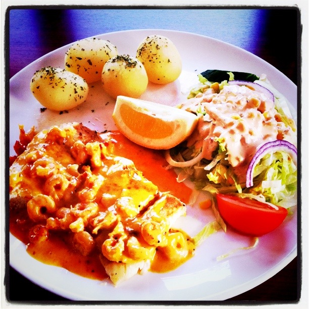 Etter å ha benyttet apostlenes hester en times tid var det tid for foring av disse hestene eller i alle fall han som red på dem og Mama Rosa så fristende ut. Slapp av kjære frue, det er bare en restaurant i Stjørdal:-) Fristerinnen i døra ønsket velkommen og lurte på om jeg ville ha en meny, takk som byr svarte jeg og benket meg med en fyldig meny i hånda. Etter å ha skummet menyen samtidig som det dukket opp noe skummende på bordet ble det til at steinbit fristet i dag. Steinbit, reker, salat osv. er mat for en sulten rytter.