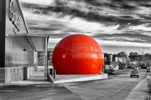 Jeg er ikke helt sikker på hva den kula er til, men har sett den tidligere. Den ble bygd for et par år siden og står ved siden av det nye kjøpesenteret. ,uligens et eller annet symbol for det. Den lyser uansett opp i terrenget.