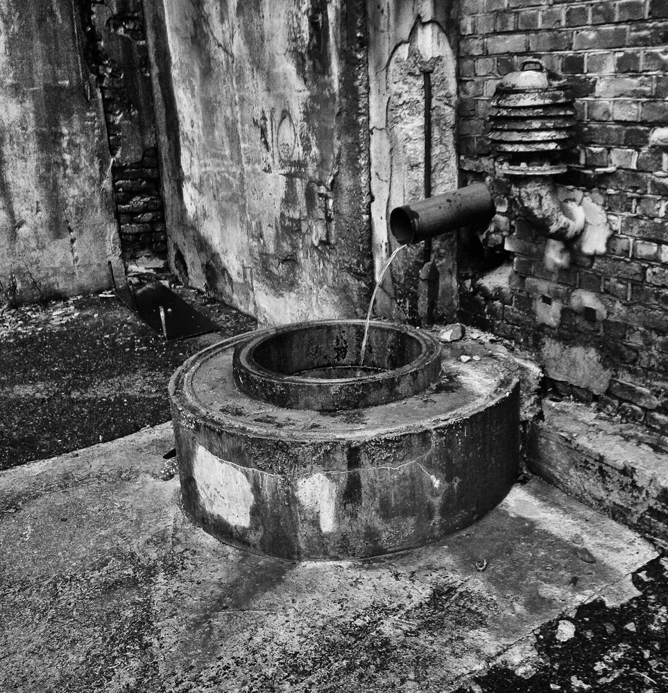 Jeg brukte noen timer i går kveld på å titte på eldre bilder og fant noen jeg gjorde om til sorthvitt. Dette her er fra det gamle smelteverket i Odda. Det rant en liten stråle med vann ned i kummen på bakken, men jeg aner ikke hva det har vært til eller hvorfor det åpent slik som på bildet.