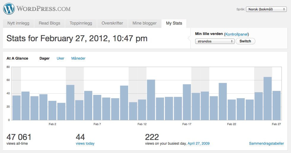 Det er en stund siden jeg var inne for å titte på statistikken på wordpressbloggen min og dette er talla jeg fikk for denne dagen.
