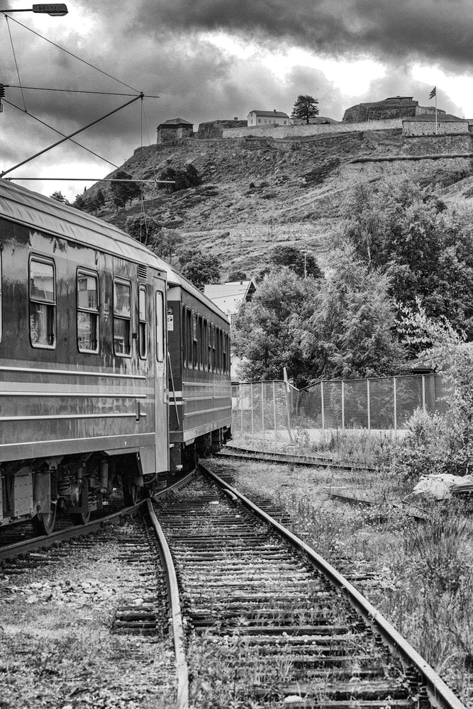 Lørdag formiddag, mellom regnskurene, tok jeg en liten tur ned i sentrum og ruslet litt langs gjestebrygga. Etter dette gikk jeg en runde via jernbaetomta og fikk med dette motivet av parkerte tog med festningen i bakgrunnen. Som fargebilde er det også helt ok, men jeg er vedlig fasinert av sorthvitt bilder. Lysspillet i gråtonene er alltid ok å følge med på. Til å konvertere til sorthvott benytter jeg meg av Silver Efex Pro II, et meget bra program/plugin til Adobe lightroom.