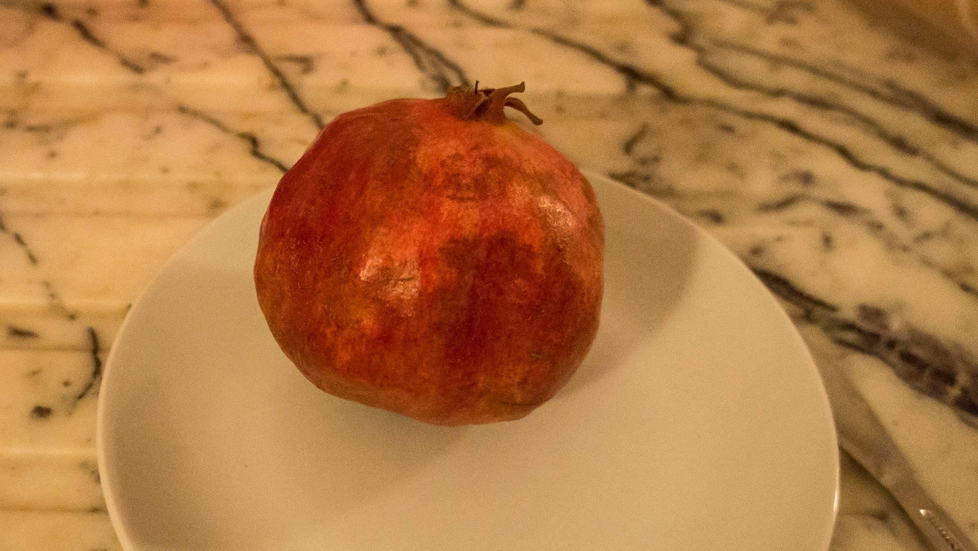 Det blir mange hotellrom og de mister alle sin sjarm etterhvert som årene går. Et rom er rett og slett et rom. Noen er flottere enn andre, men de aller fleste går under kategorien greie.  Granateple på rommet mitt