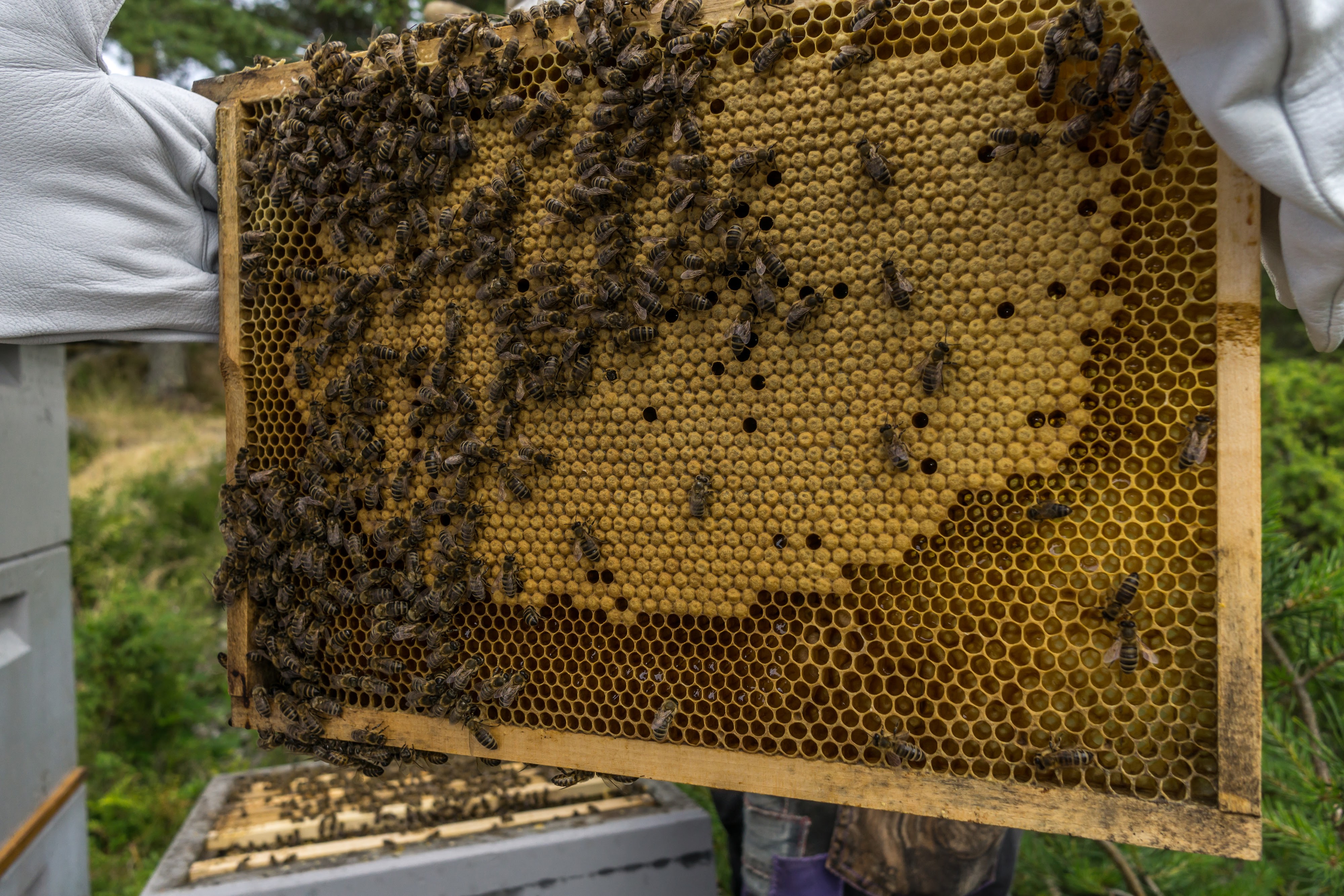 Venner av meg har begynt å holde bier og de har to bikuber. I går da jeg var innom skulle de gjennomgå kubene og da var ikke sen med å ta en del bilder. Her er ett som viser en ramme fra dronningetasjen i kuben(nederst) hvor fullt av larver er i ferd med å komme ut av sine små «boliger».