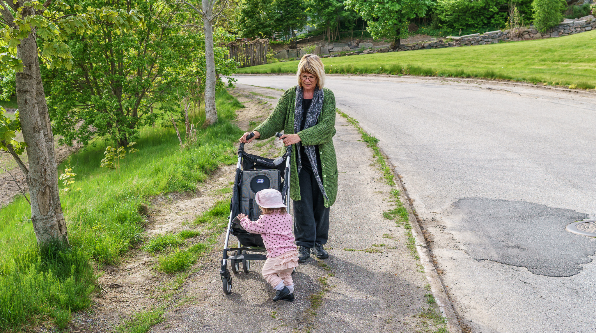 Nå kan vi låne barnebarn og hund og levere tilbake når det blir «nok» 🙂 Kompis vet å passe på oss i flokken og når minstetulla sovnet så la den seg nederst i senga for å holde vakt over henne.