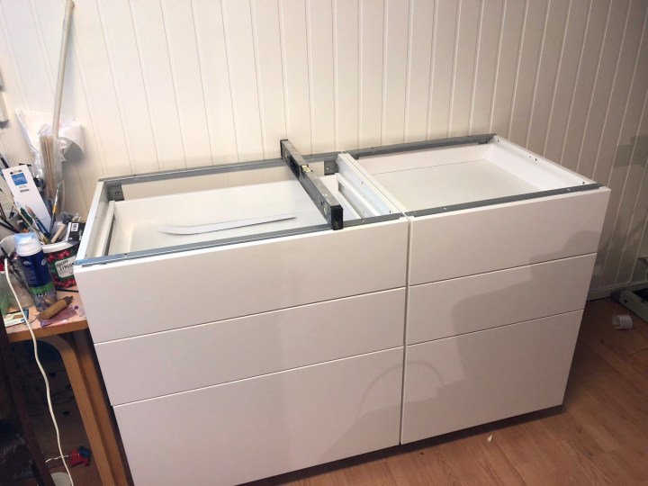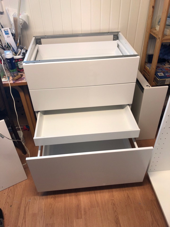 Stine ville ha noen ny skap i hobbykjelleren og da kjøpte vi rett og slett IKEA-innredning. Skuffer og skjulte skuffer blir helt topp og det tåler også en del mer enn vanlig skap. Dette blir nok bra. Noe senere kommer det også overskap som på et vanlig kjøkken.