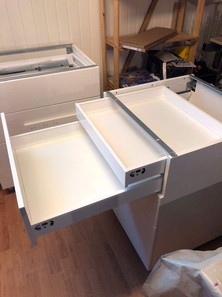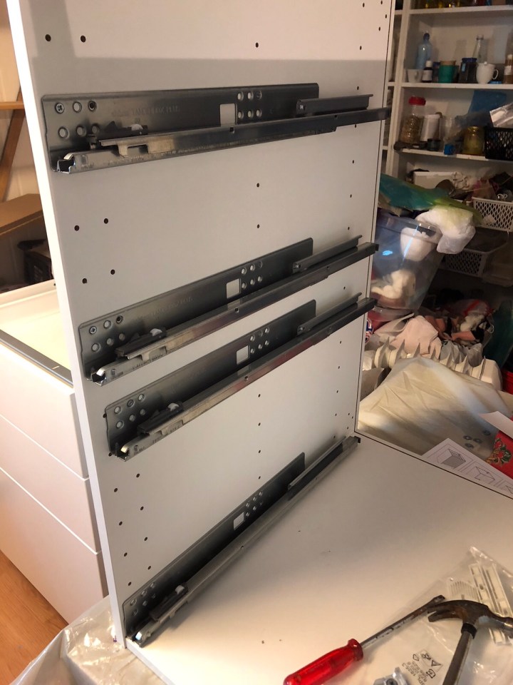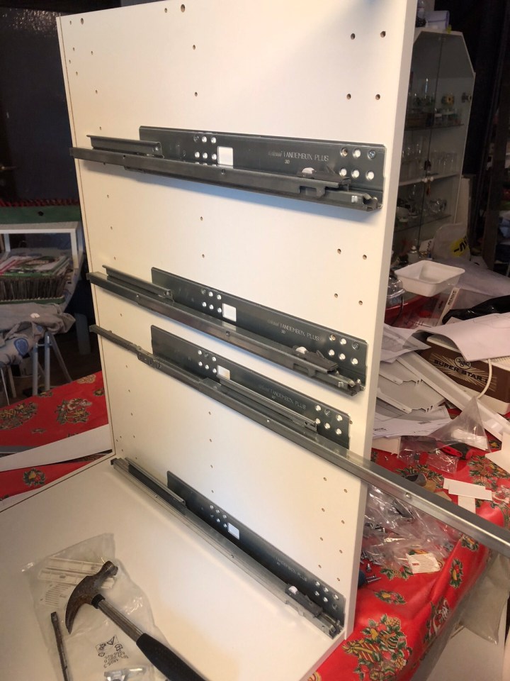 Etterhvert som jeg holdt på med skapene satte jeg på det meste av delene siden jeg visste hvor skuffene skulle være. I stedet for å ta alle skinnene til slutt ble de satt på før skapet ble satt sammen. Effektivt og greit. Sparte faktisk en del tid på skapene på denne måten.