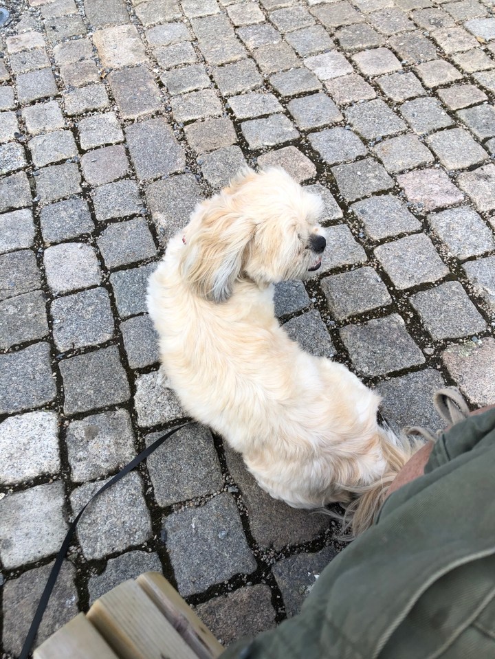 Har satt meg på benken i dag og Stella ligger i skyggen her. Familien handler på Tistasenteret og dit inn kan ikke hunder være med.