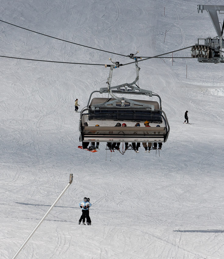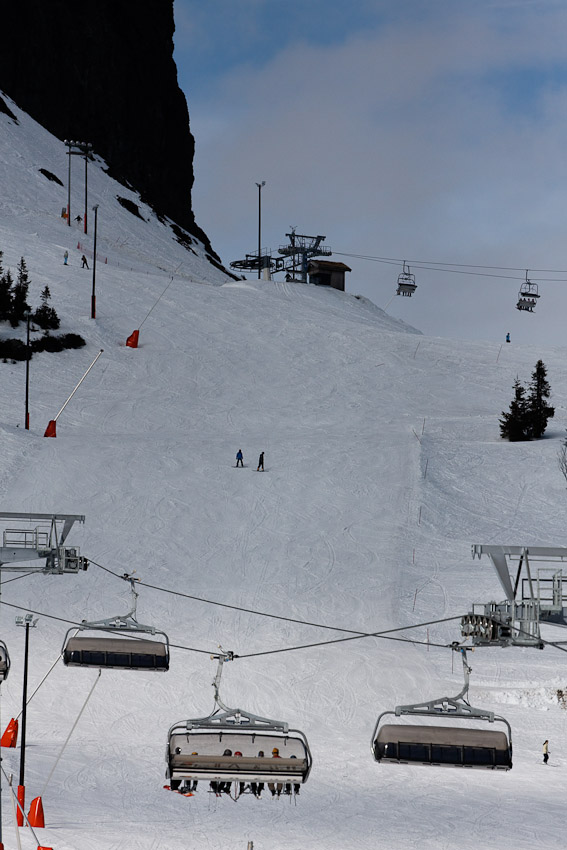 Oppe i bakkene går heisene for fullt og det er mennesker overalt som kjører på kryss og tvers i løypene. Snøen virker litt råtten nå, men det ser ikke ut til å legge noe demper på gleden ved å rase avgårde i bakkene.