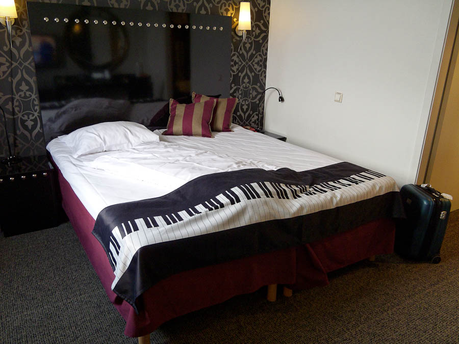 Senga hadde et overtrekk med pianostil. Ganske gjennomført rom.