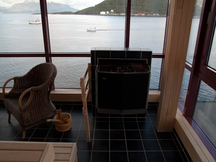 I etasjen under meg var det et flott Relaxrom som det nå heter på norsk. Her var det også en badstu med utsikt over Harstad. en av de flottere jeg har sett her i landet. Badstua er i gang til 22:00 og jeg må ta en tur dit før de stenger i kveld.
