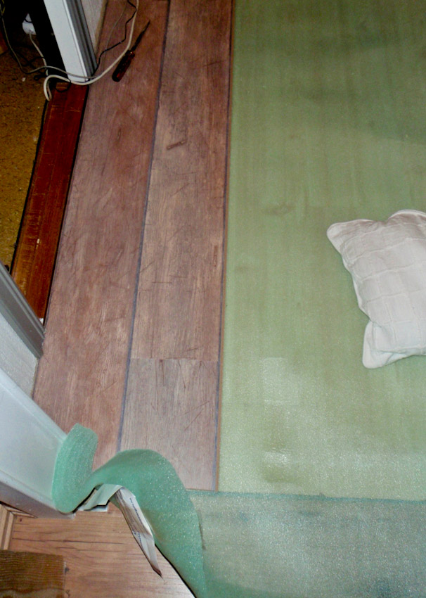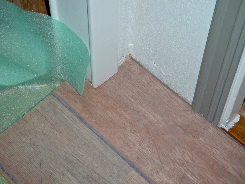 Slik ser gangen ut før jeg begynner på gulvet. Først må alle listene ned fra dørene, men det er fort gjort da de ikke er spikret fast, men bare så vidt nestet på plass etter at de ble malt tidligere i uka. Gulvet er støvsugd og det lille som står igen flyttes inn på et av soveromma. Det gamle gulvet lar jeg ligge for det består av limte trestaver og er ikke så lett å brekke opp. Dessuten er det nok høyde å gå på også. Det nye gulvet bygger 1 cm, men det fortsatt god klaring til tersklene.