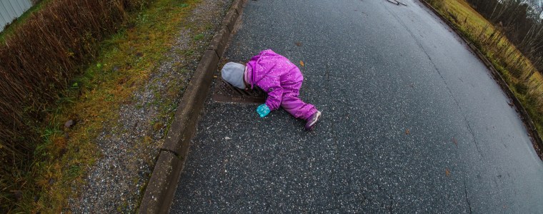 Lufting av hund er ikke noe jeg gjør veldig ofte da jeg ikke har hund. Denne hunden her – Kompis – er det min sønn og samboer som har. Kompis er en herlig krabat som alltid er veldig glad og barnebarnet koser seg med den. Her går vi tur på lørdag formiddag.Barn i denne alderen spør om alt og på toppbildet ligger hun på alle fire og titter ned i sluket i veien. Det var bare å ta seg tid til å forklare hva det skulle være til og etter en stund var hun fornøyd og ruslet videre med hund og meg.