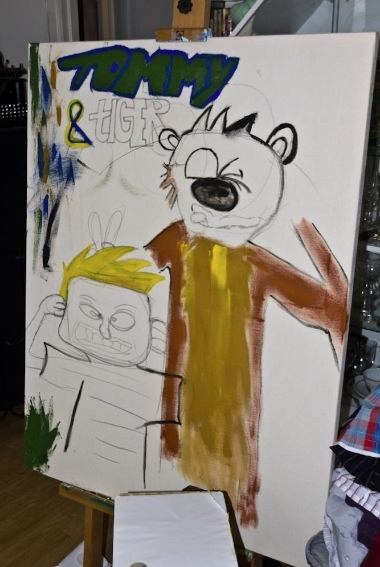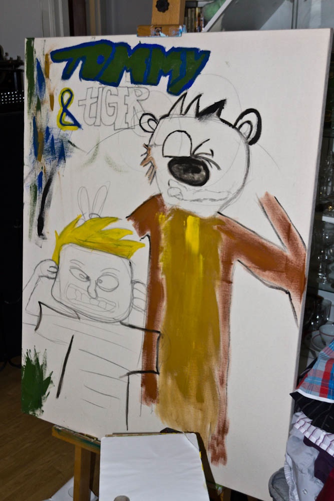 Jeg hadde satt opp et stort lerret og Daniel gjøv løs på det med en gang han kom inn på søndag. Motivet i dette tilfellet var greit, han ville lage noe med Tommy & Tigern og kullstiftene for lystig over duken. Nå hadde jeg ikke så mye oljemaling igjen, men han plukket farger og har så vidt begynt med å fylle inn litt her og der. Nå skal det bli spennende å se om han rekker å bli ferdig i løpet av uka.
