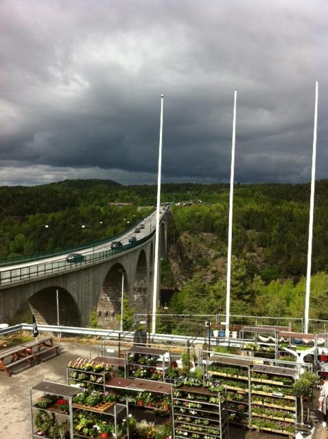 I dag hadde vi tenkt oss en liten tur ut til Nordby, men da vi nærmet oss skjønte vi at dette ikke kom til å bli gøy. Hele Østfold og litt til var nok på tur hit. Strømmen av biler som kom ned fra E6 mot Nordbysenteret var enorm, en lang rekke av biler som bare krøp avgårde. Vi tok en runde i første rundkjøring og satt kursen hjemover. Vi bor bare noen kilometer unna så vi tar heller turen i morgen. På hjemvei stoppet vi på Svinesund på svensk side og spiste middag i søndagsbuffeen deres. 155,- SEK og bra utvalg med mat er ok og vi har vært her noen ganger gjennom årene. Enda var det så tidlig at det var greit å finne plass her, men på den tiden vi satt der begynte det å fylles opp. Populært sted. Bildet tok jeg da jeg kom ut på trappa og man kan se at skyene henger tunge over Norge her.