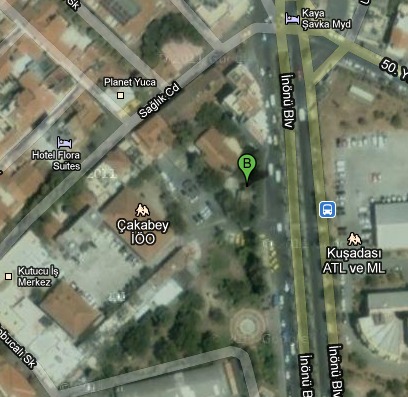 Vi er ofte i Kusadasi og begynner å kjenne byen litt etter mange besøk. Nå er kjenninger fra Halden der nede for første gang og de lurte på steder å spise utenom All inclusive – hotellet de bor på. Midt nede i byen er det en hyggelig kebabrestaurant vi ofte benytter. Det er som en vanlig restaurant, men de har et stort tilbud av bare kebabretter. Smaker meget godt. Kebab må da ikke forveksles med vår lokale variant som du får i gatekjøkkenet og deretter slurper i seg. Restauranten befinner seg der merket B står.