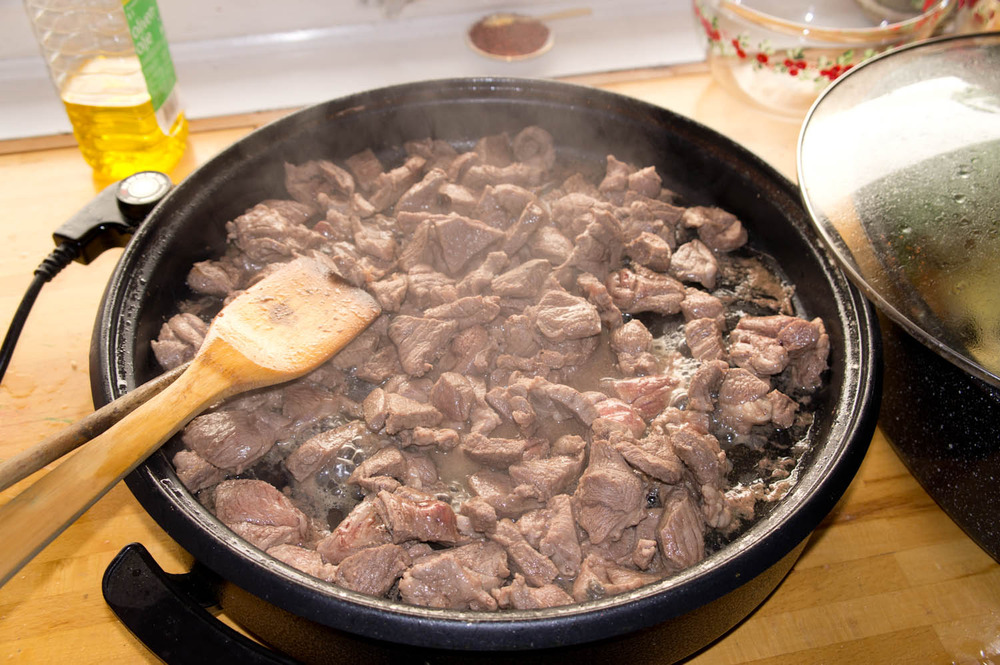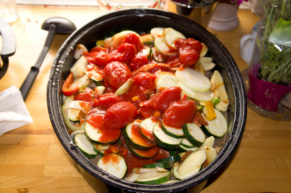 Her holder jeg å forberede gryta med Güvec hvor det lagvis ligger lam og grønnsaker av diverse slag.
