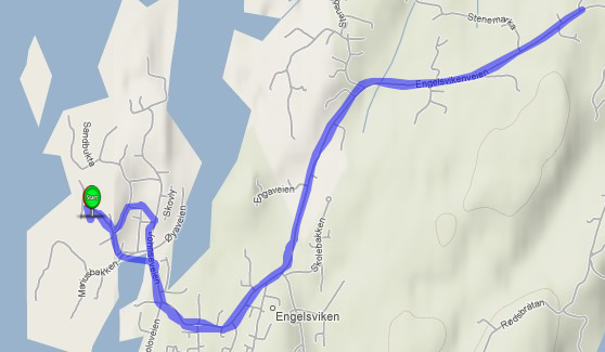 Så tok jeg en liten tur med min nye sykkel og det var gøy. Dette var noe helt annet å sykle med enn min gamle DBS. Trek-sykkelen er jo kanskje av en litt annen kvalitet også? Hvis dette kan hjelpe meg til å komme i bedre form så er det bare bra. Bildet viser dagens rute her ute i Engelsviken. Turen var ikke lang, bare rett under 3 km, men det er bedre å begynne pent og ta den samme turen flere ganger.