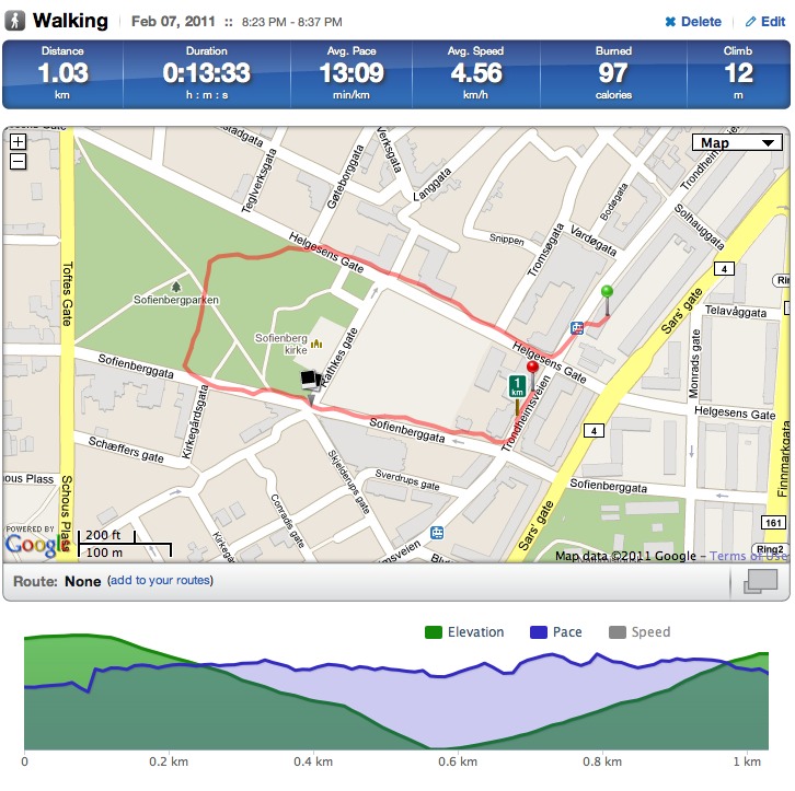Dette er dagens tur til jobben fra leiligheten i Oslo. det er for det meste oppoverbakke hele veien og da synes jeg ikke det ble så gal tid ut av det. Ikke skulle jeg komme svett til jobben heller. 14 min. og 10.7 km i snitt synes jeg er helt ok.