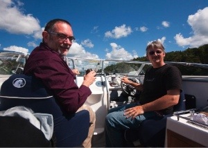 Vi gutta er også med, men sitter litt lenger frem i båten. Damene har slått seg ned i sofaen bak og ser ut til og trives der.