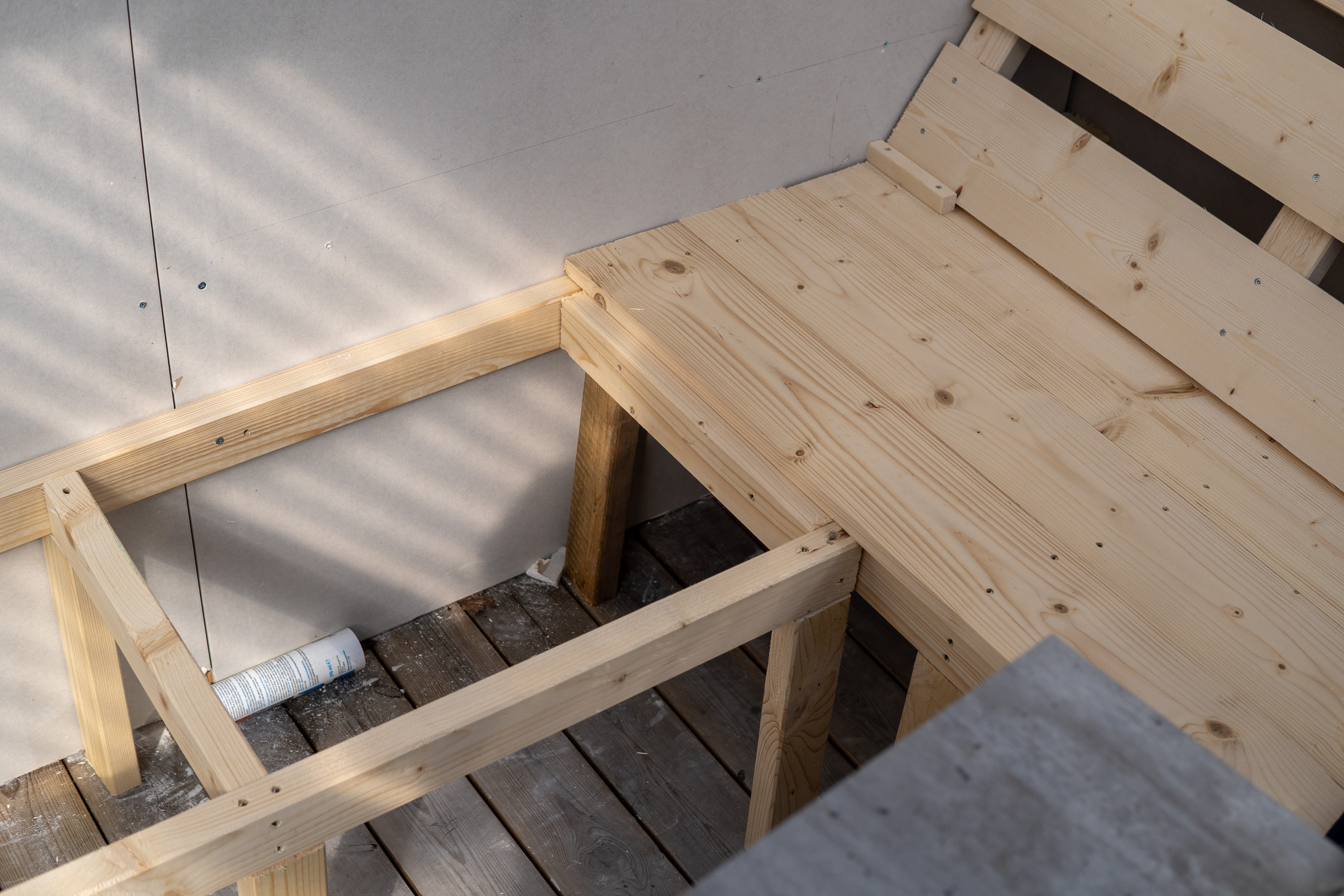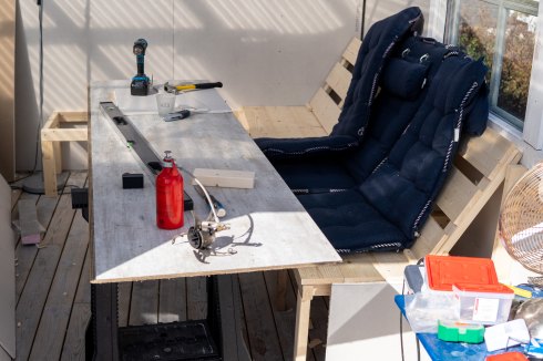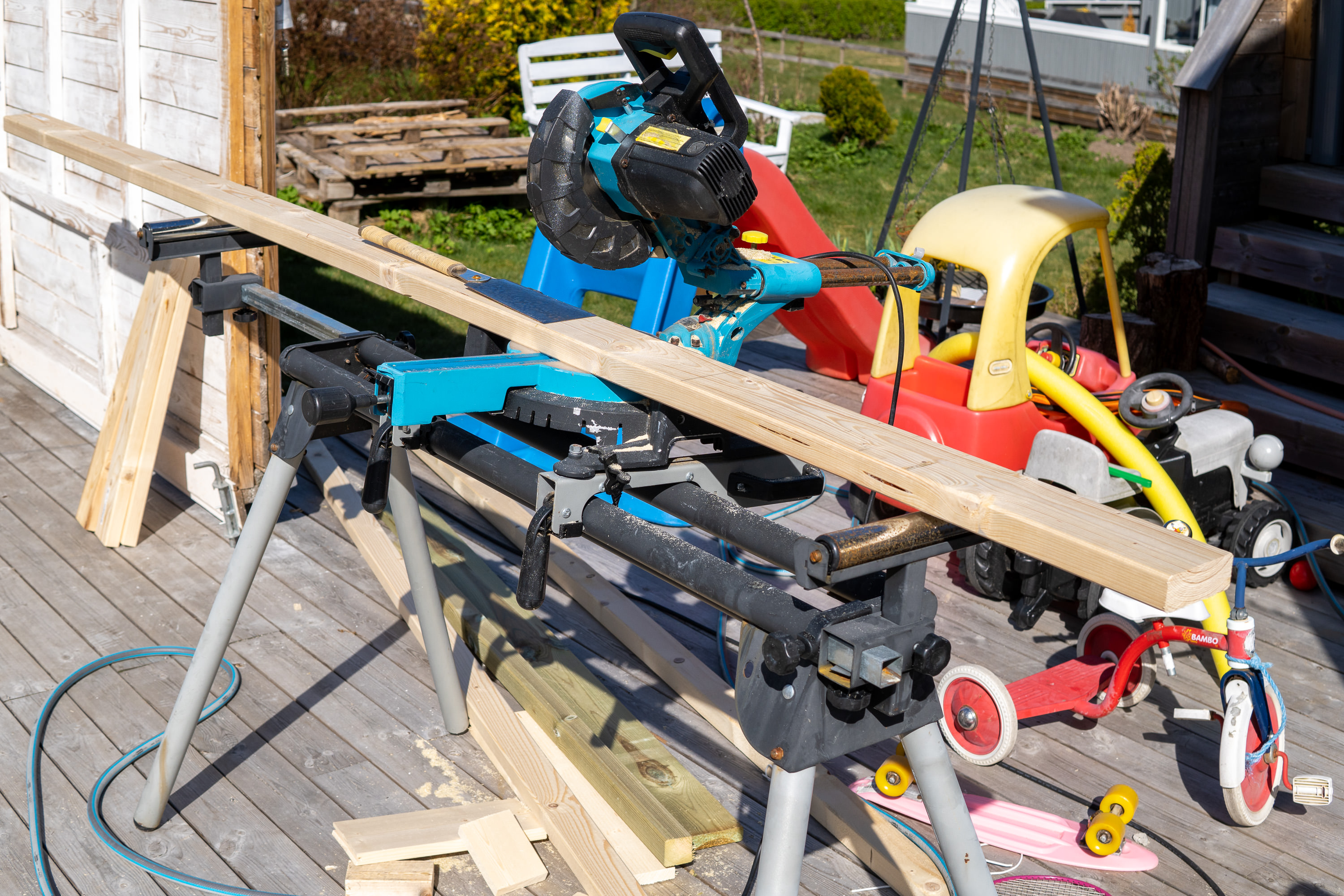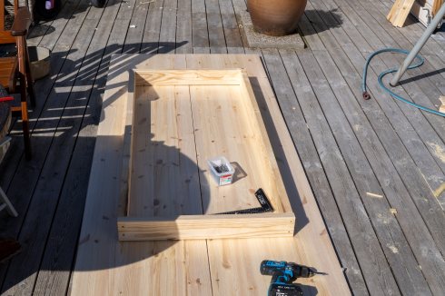 Foreløpig er det bare to bukker med en arbeidsplate jeg benytter for å slippe å jobbe med alt nede på gulvet. Helgen gikk ganske fort unna og på søndag kunne jeg slappe av og spise kveldsmat ved det nye bordet i paviljongen. Det ble stødig. En del 2″*4″ som skrudd sammen kommer ikke til å flytte seg med det første. Til selve bordplata kjøpte jeg to hobbyplater som ble satt sammen og bordet ble 1m*2.3m. Det blir plass til mange rundt det bordet der.