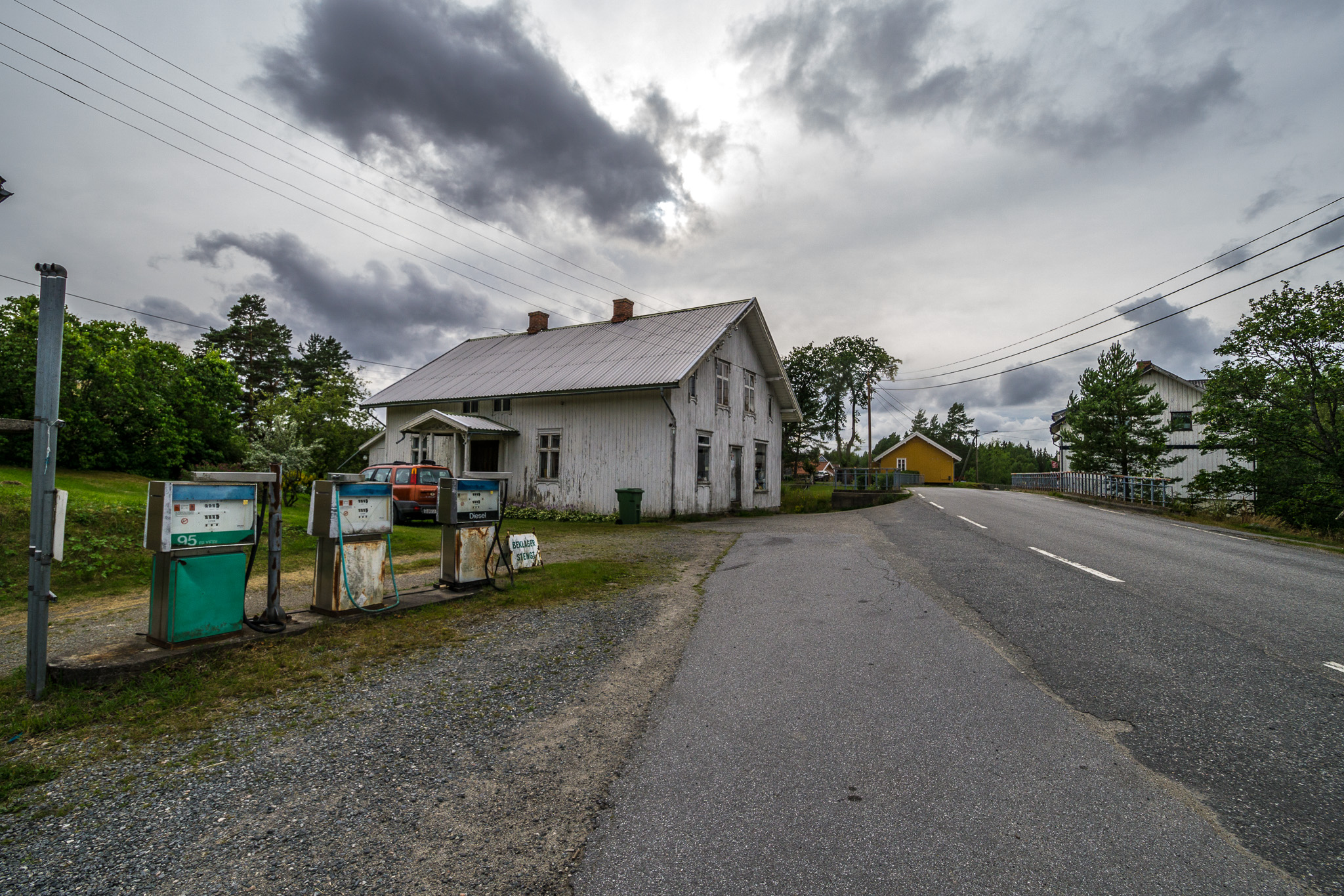 Oppe på Strømsfoss finner du denne gamle bensinstasjonen. Den har nok ikke vært i bruk på en del år tror jeg.