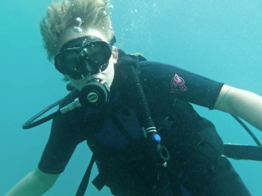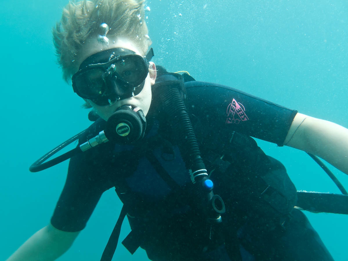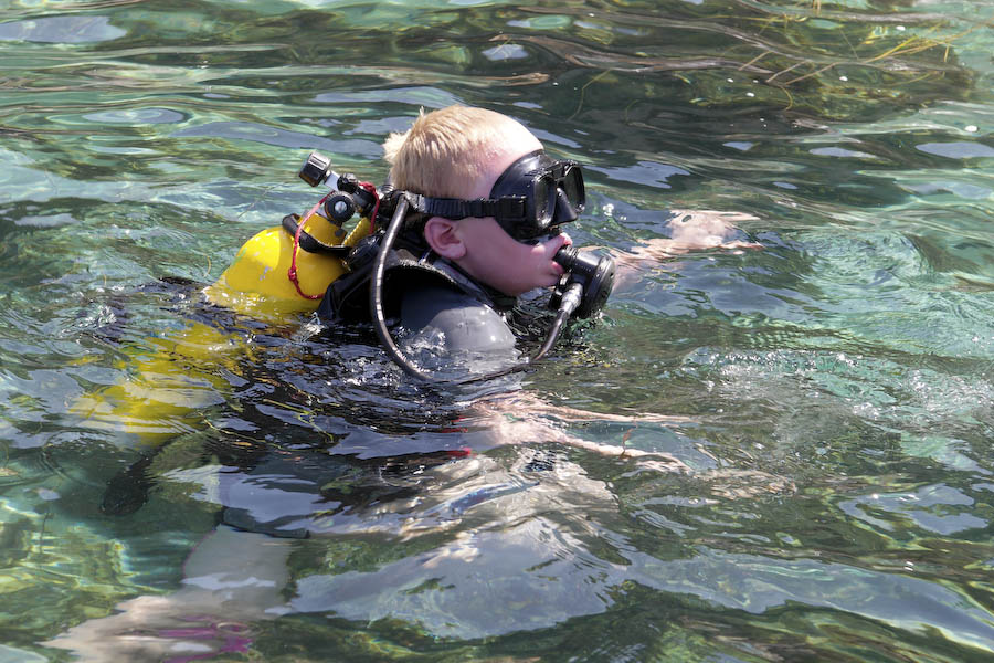 Jeg hadde bestemt meg for å dykke, men ville vente til barnebarnet kom ned. Han tok juniorsertifikat for 2 år siden da han var 10, men det kan han ikke bruke i Norge da det ikke er lov å dykke med flasker der når man er så ung. Nå dro vi til dykkersenteret og strappet oss inn i drakter, vester og flasker. Det er deilig når man kommer under vannet og kan leke fugl.