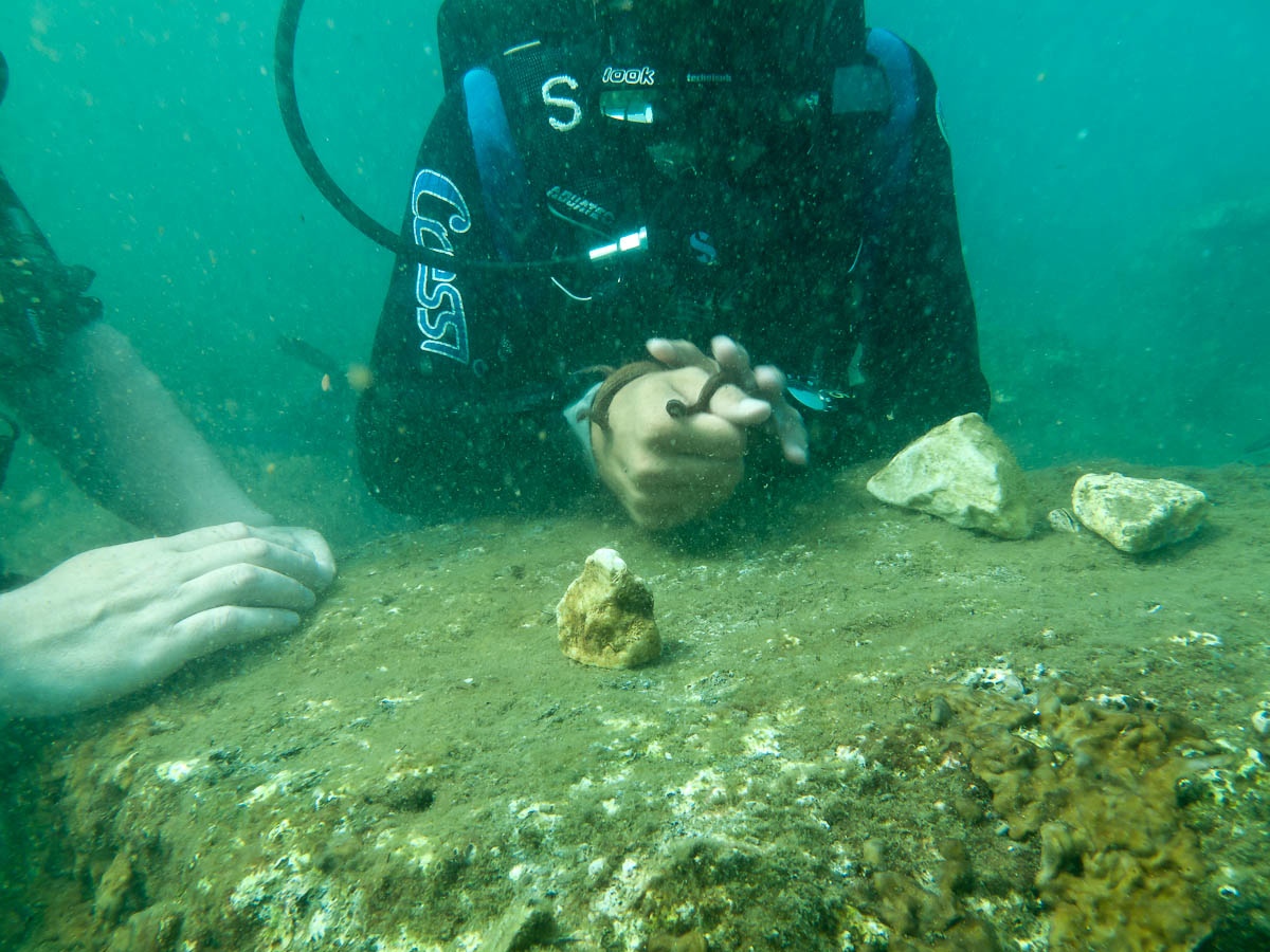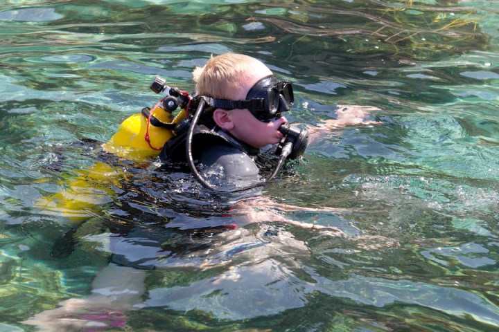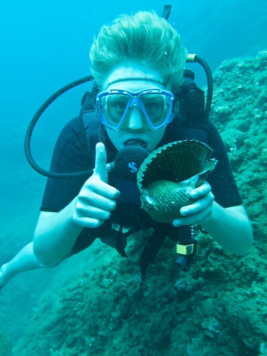 Her har Daniel funnet et fint skjell nede på bunnen. Han er som en fisk i vannet og nå når han har blitt gammel nok får vi begynne å dykke i Norge med ham også.