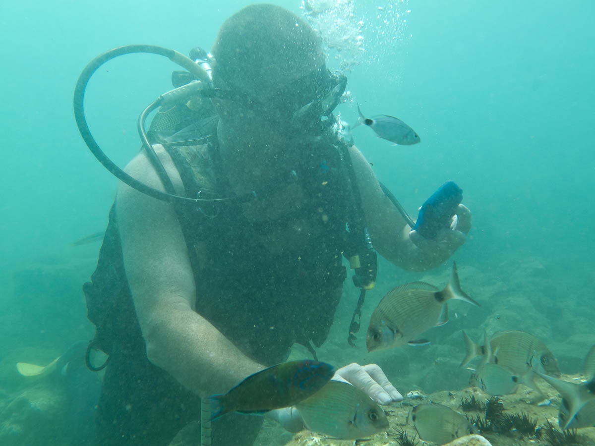 Denne dagen hadde jeg gjort en stor brøler og glemt vaselin. Siden jeg har bart siver det inn vann før jeg kommer så dypt at masken virkelig presser seg mot huden. Derfor måtte jeg stadig tømme den under vann. Man ser jo litt bedre når øya ikke bader i saltvann i maska. Vaselin i barten gjør susen, iallefall under vann:-)