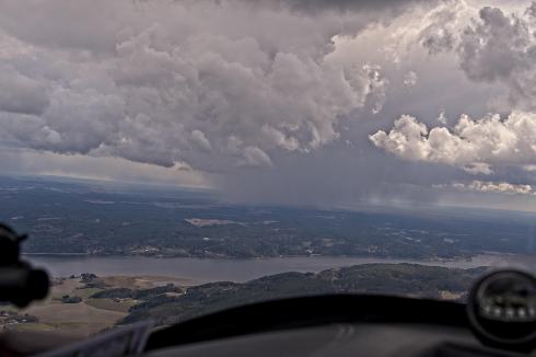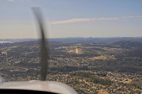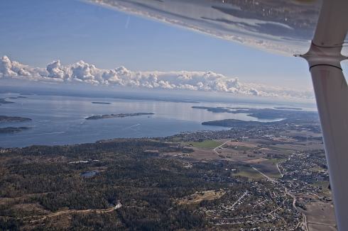 Lørdag morgen ble det tid for en flytur til Geiteryggen. Kameraten min og jeg tok av fra Rakkestad flyplass rett før 10:00 og satt kursen mot Skine. Det var pent vær, men veldig humpete flyvær. På Østfoldsiden var det mye turbulens, men det roet seg over fjorden og på andre siden. I åsene ved Skien var det igjen en del urolig luft. Vi fikk allikevel en topp tur. På Geiteryggen ble det kaffe og rekesmørbrød på kaféen der og en hyggelig prat med andre eldre piloter som samles der på lørdagene. Etter vel inntatt måltid og en hyggelig prat bar det ut til sjekklister og ny flytur, denne gangen tilbake over fjorden og deretter en tur over Sarpsborg og Halden. Samtidig svingte vi utom Langholmen slik at jeg fikk noen nye bilder av campingplassen «vår».