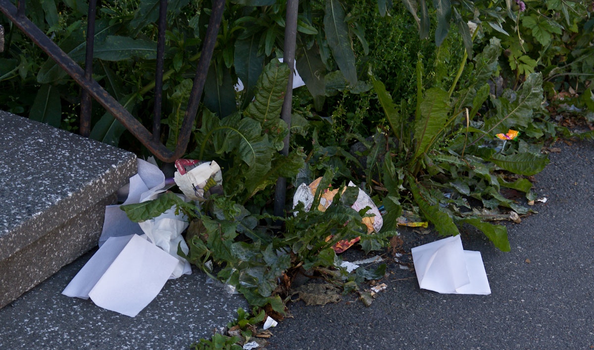 Etter at jeg kom inn til Oslo i kveldinga så gikk jeg en tur ut og tok med kameraet som vanlig. Ved inngangen til naboblokka så det slik ut. Søppel finnes overalt i Oslo og det ser ut som om folk slipper det rett ned der de står. Det er ca. 3 meter fra denne trappa til store søppelcontainere, men det er nok for langt unna ja.