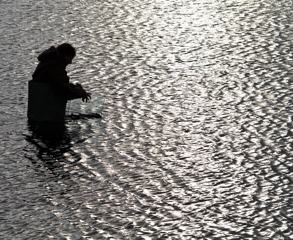 Hun var fra Belgia og filmet video. Det ser kanskje litt merkelig ut sa hun, men det lille akvariet fungerte utmerket for å ta film på det dypet hun trengte. Nede i bunne av glassburet lå kameraet og når hun senket det ned under vannflaten ble det flotte opptak av bunnen der. Mye smarte løsninger man kan finne på. jeg fikk også et ok motiv i henne i silhuett mot sola.