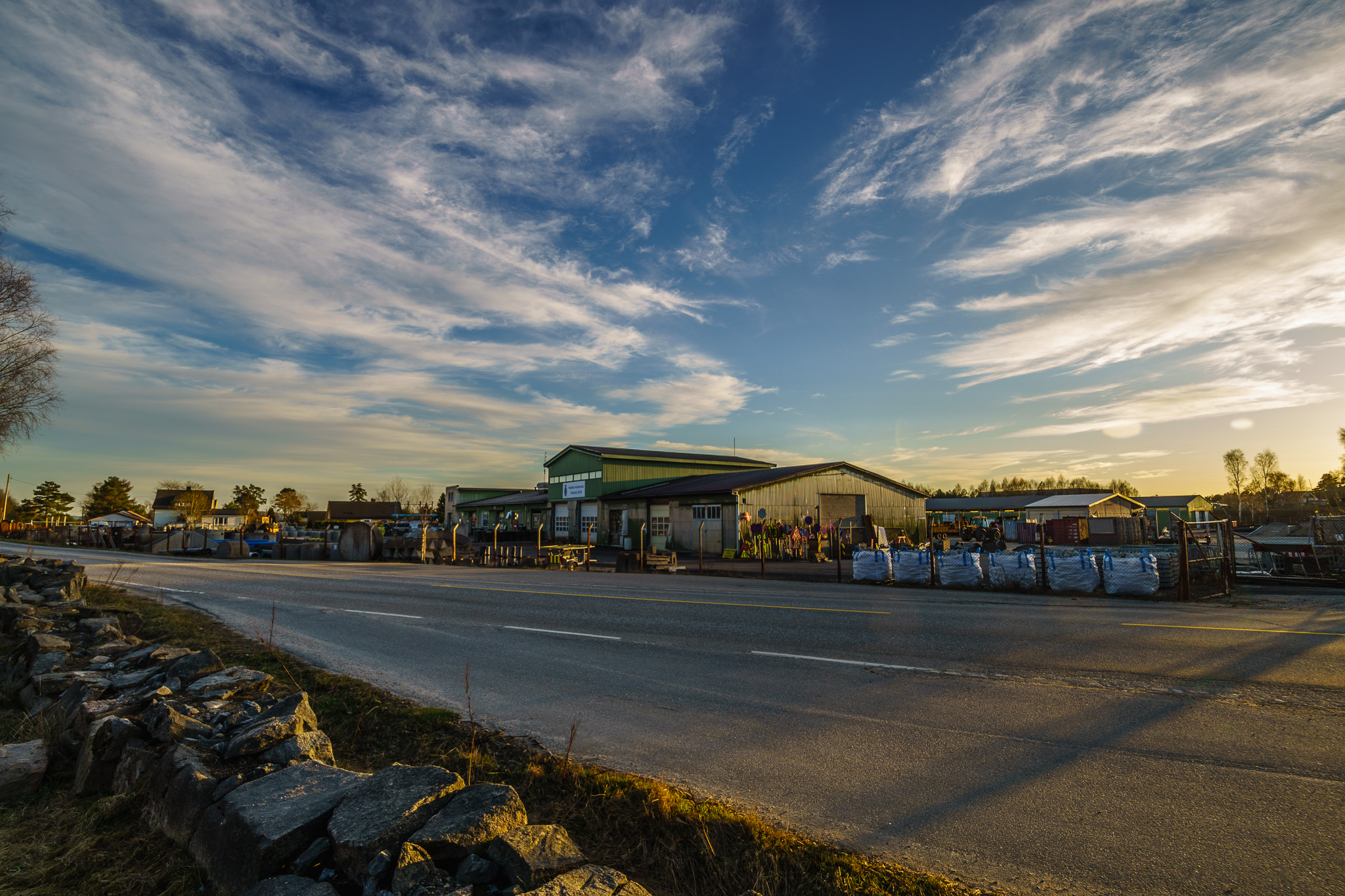Kona og jeg gikk tur her i helga og det var et flott vær. Nå gikk vi lett sent på ettermiddagen så det begynte å mørkne litt, men det var fortsatt ok lys til å ta bilder i. Her ser vi kommunelageret på Sommero tatt med en Samyang 10mm 2.8 på et Sony a6000-hus. Jeg elsker det lille nye Sonykameraet mitt og angrer ikke på at jeg byttet fra Canon til Sony.