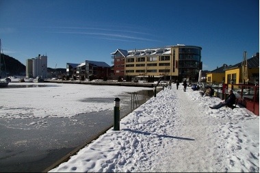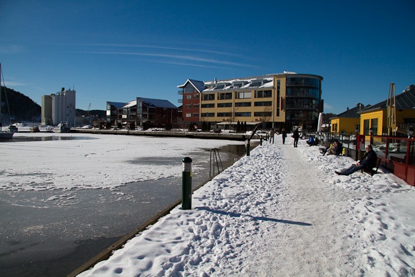 Uansett så kjentes det deilig å sitte der i sola og kjenne at den stekte til tross for kuldegradene i lufta. I selve sola var det nok ganske mange varmegrader og det kjentes så varmt at man hadde lyst til å kneppe opp litt, men klok av skade fikk det være. For de som ikke er kjent i Halden er bildet tatt på Sydsiden nede på gjestehavna og det er det mye Thonhotellet som sees i enden av brygga.