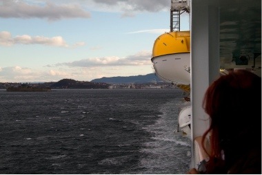 Hurtigruten sklir avgårde gjennom ulendt terreng, men det er ikke mye vi merker til det ombord. Her er det omtrent som å gå på stuegulvet hjemme. At det blåser merker man i det man vil ut på dekk. På vindsiden er det nesten umulig å åpne døra pga vindpresset.