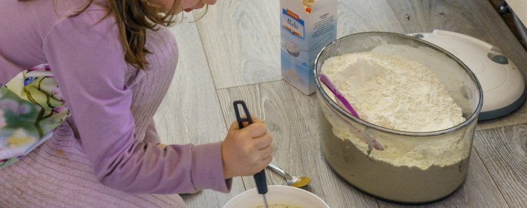 Når man er for liten til å rekke opp til benken for å røre i deigen tar man gulvet til rådighet. Jenny elsker å bake selvom hun bare er 5 år gammel. Oppskriftene finner hun på selv og det meste av det hun baker kan godt spises. Ofte står den store Kenwoodmaskinen vår fremme og da benytter hun den. Det tok ikke lang tid før hun lærte å bruke den. I dag stod den i skapet og benkene var fulle av varer som var innhandlet for helgen så da tok Jenny en bolle med seg ned på gulvet i stedet. Her er hun godt i gang med å røre deigen og det ble kanelkake denne gangen. Det eneste som ble litt feil denne gangen var nok doseringen av søtning. Kaken ble god og meget søt, men hun fikk til en fin stekefarge på den og vi koste oss med et stykke til kaffen, som ikke trengte noen sukkerbit i dag.
